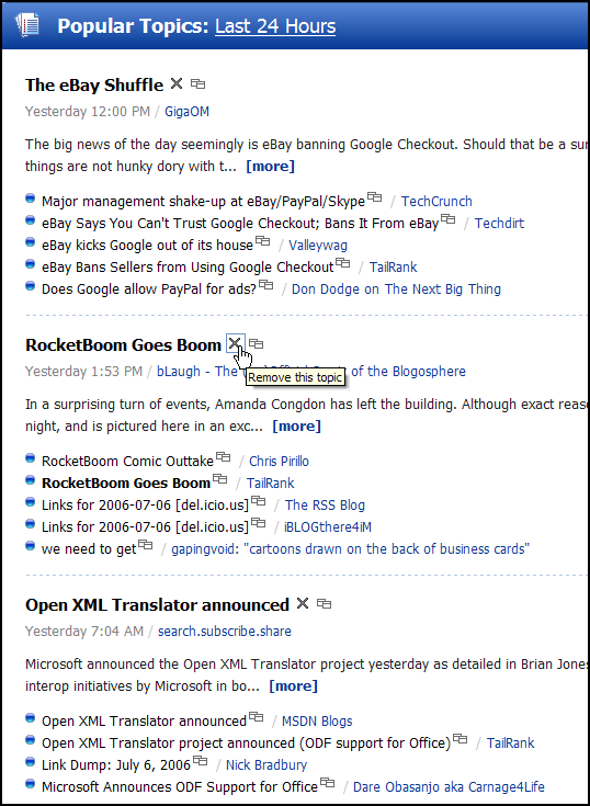 One option (which is admittedly easier on the client side than the server side) is to simply enable the user to hide a specific topic. I like this idea because users are way smarter than their software when it comes to figuring out what they like. So, this is what I’ve decided to do in FeedDemon – you simply have to click an icon to remove a topic [screenshot].