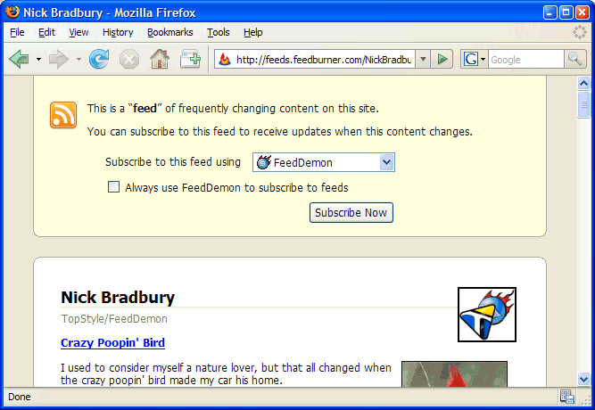 I just installed Firefox 2 RC1, and was pleased to find how much better the feed handling is over Firefox 1.5. For obvious reasons, I was never wild about how Firefox 1.5 didn’t enable choosing an external feed reader when subscribing to a feed. Firefox 2 gets it right and provides a simple way to choose your favorite feed reader. Nice!